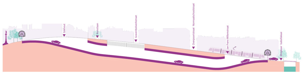 1. Een dubbele onderdoorgang voor het doorgaand autoverkeer onder de Heuvelpoort (verfijning van het conceptplan op de Gentspoortbeurs);
